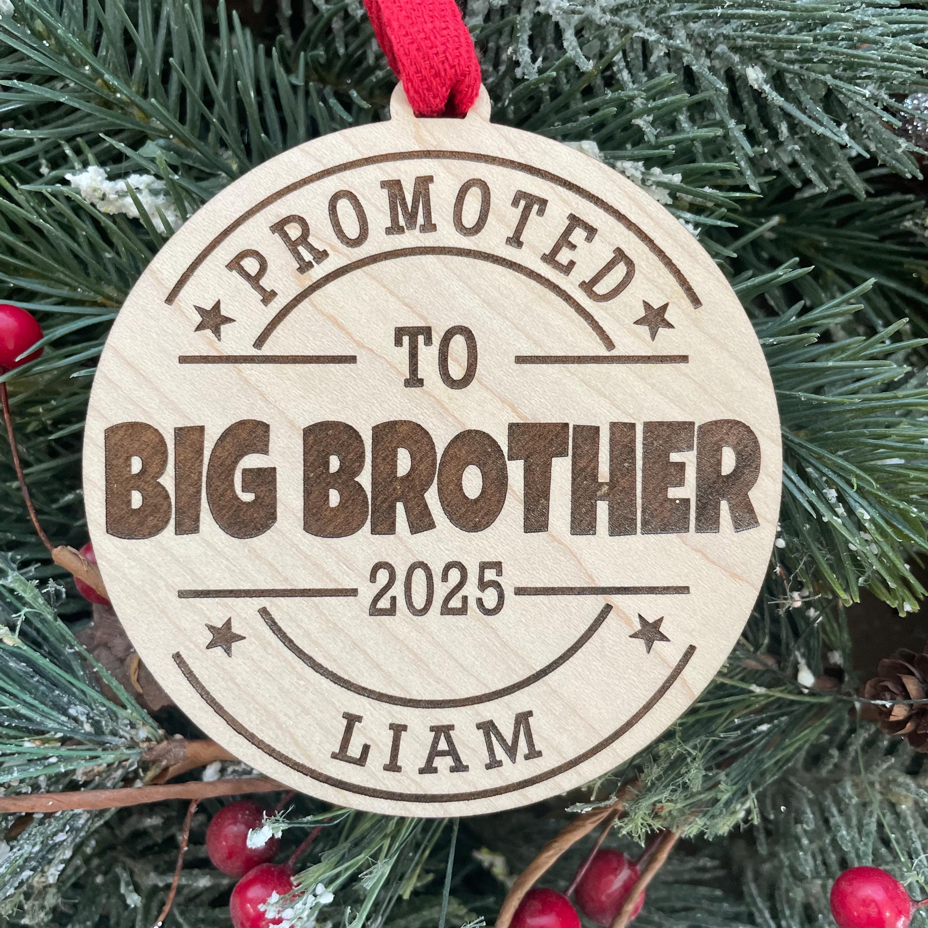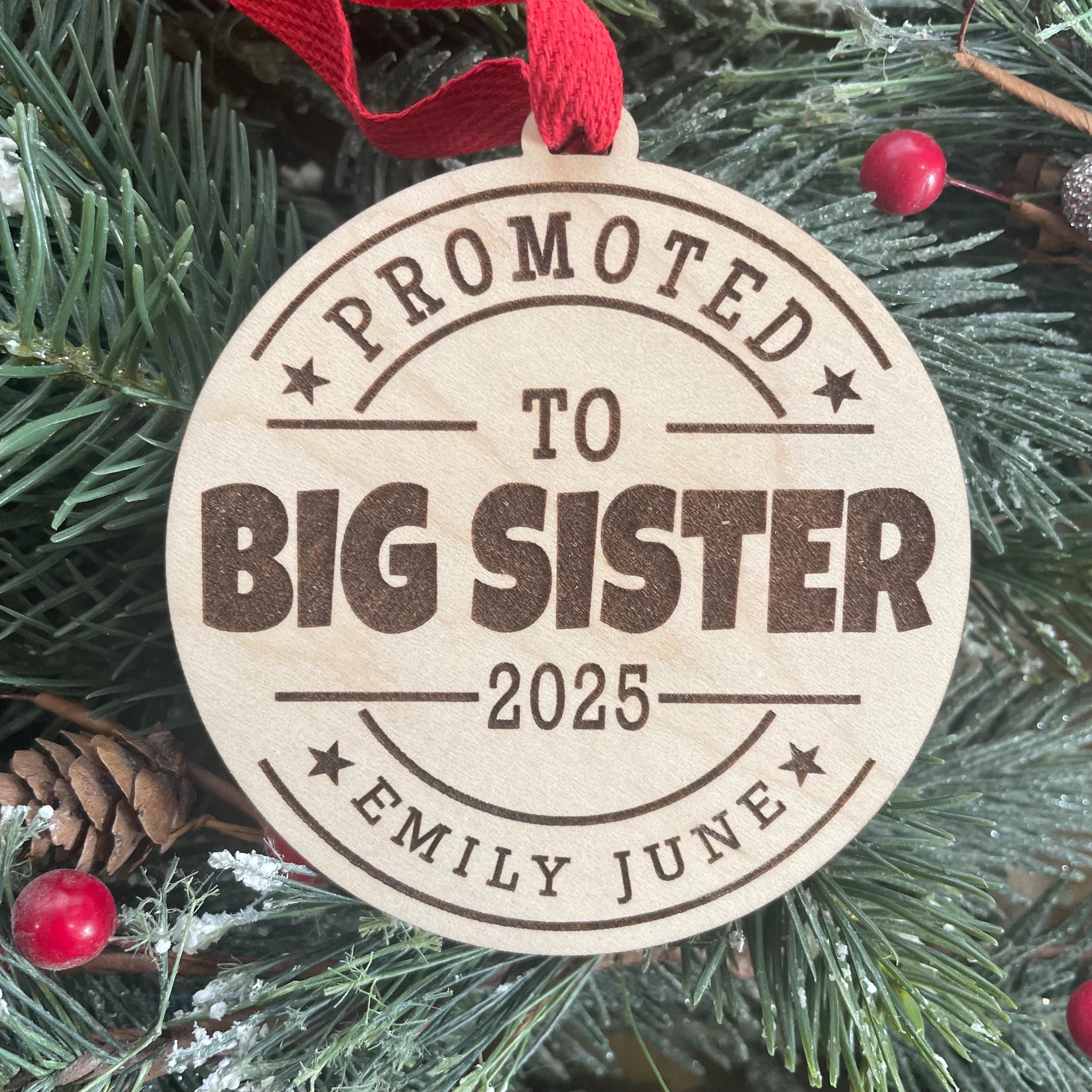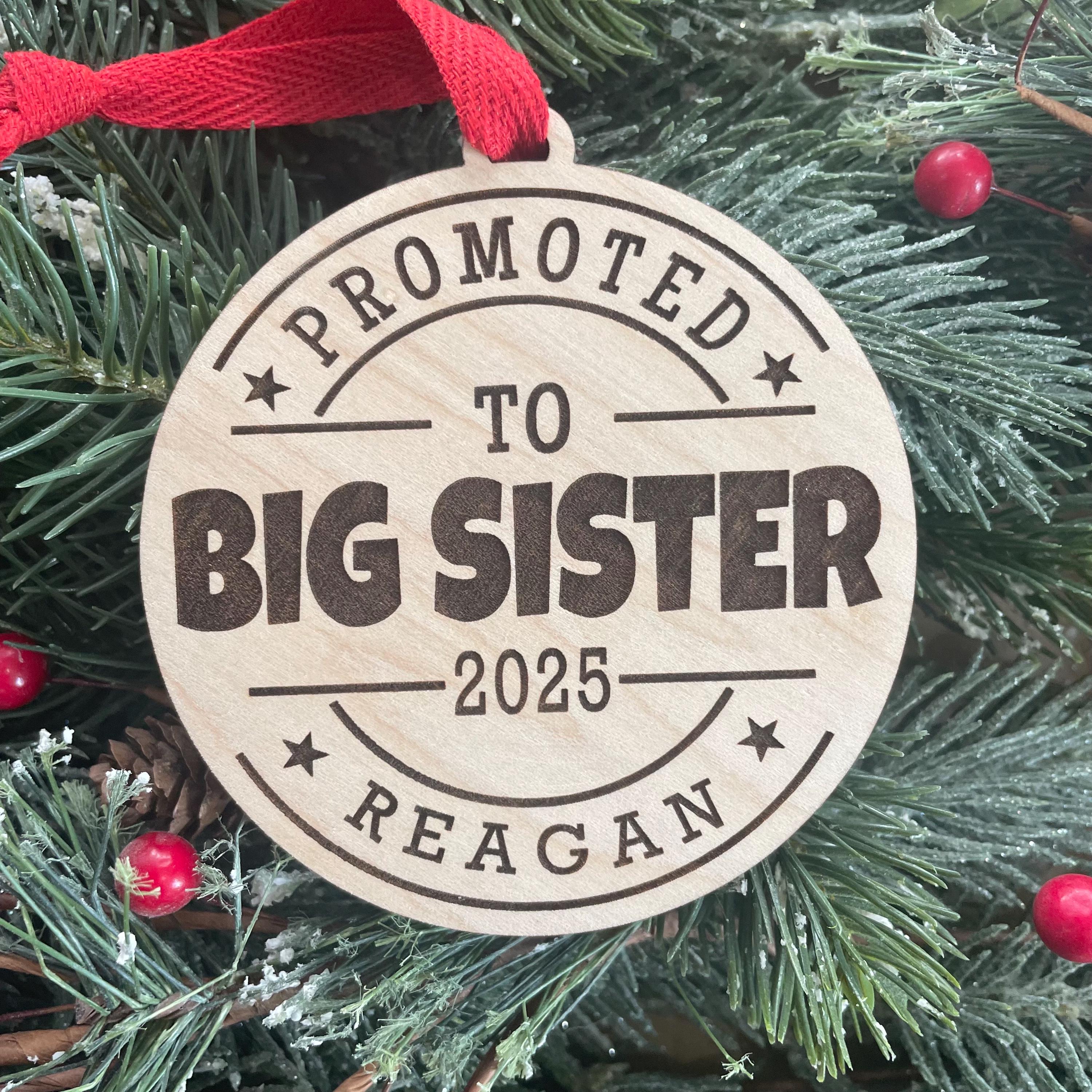 Make the special occasion one to remember with this 3.5-inch birch wood ornament, engraved with the words “Promoted to BIG SISTER,” the year, and the child’s name. Simply hang with the included ribbon (design may differ from shown) for an easy display.