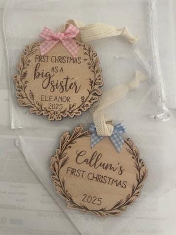 Celebrate a momentous occasion with this custom “First Christmas as a Big Sister” ornament! Measuring at 3.5 inches, this .25-inch thick birch wood ornament is laser engraved with its cheerful design; it’s also topped with a pink and white bow.