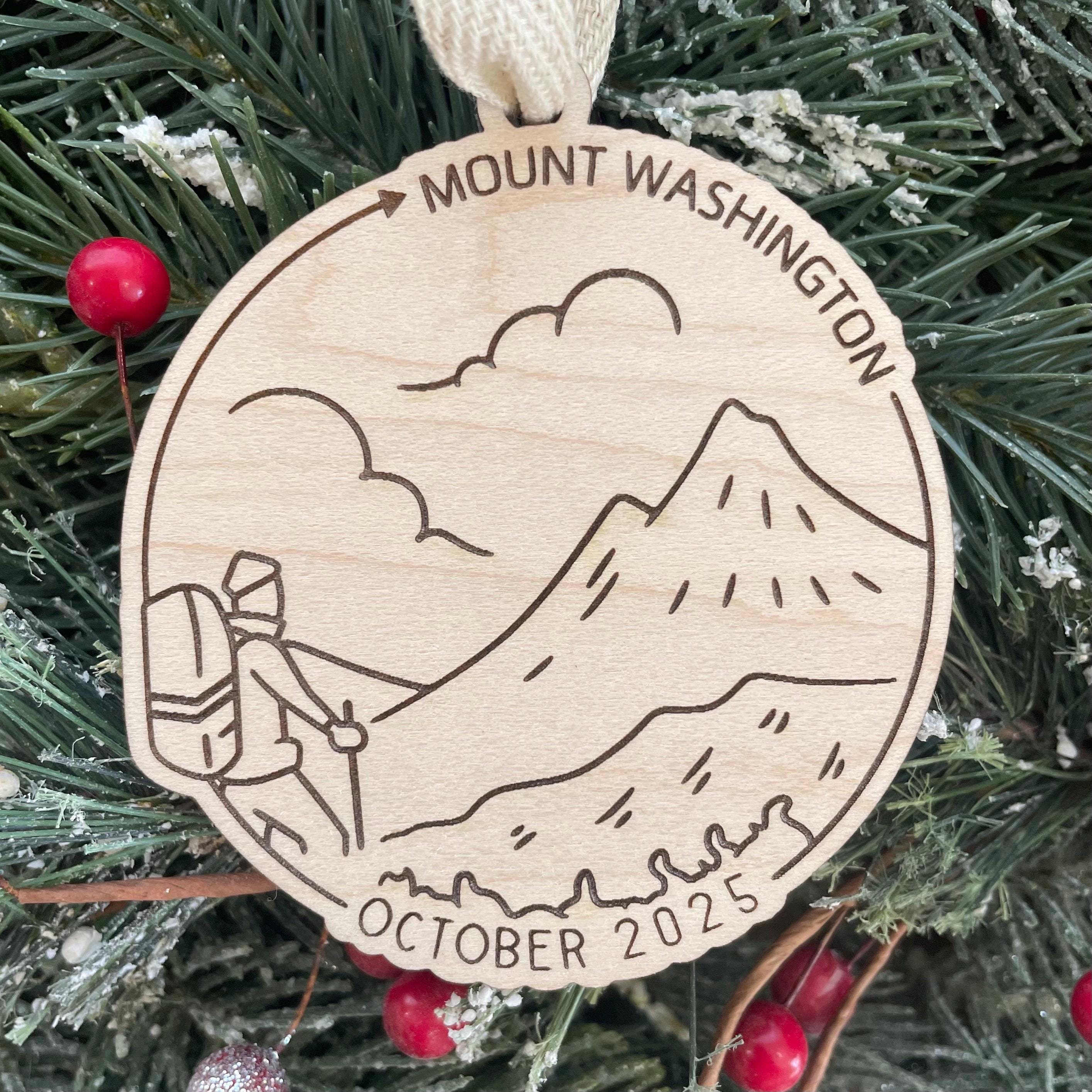 3.5 inch birch wood ornament engraved with the mountain name and date of hike. Add a name, date or short note to the back. Ready to hang with ribbon (ribbon may vary from photo.)