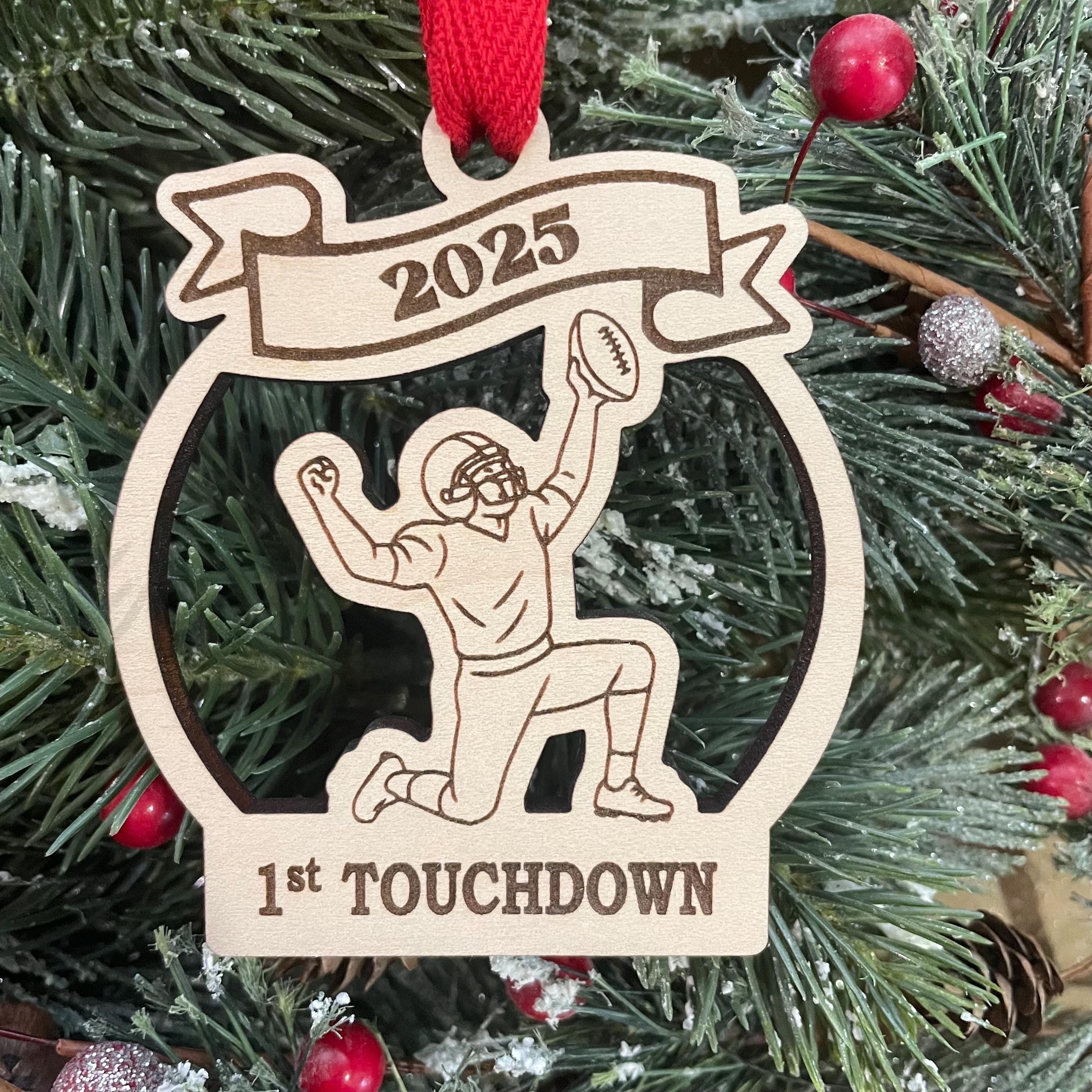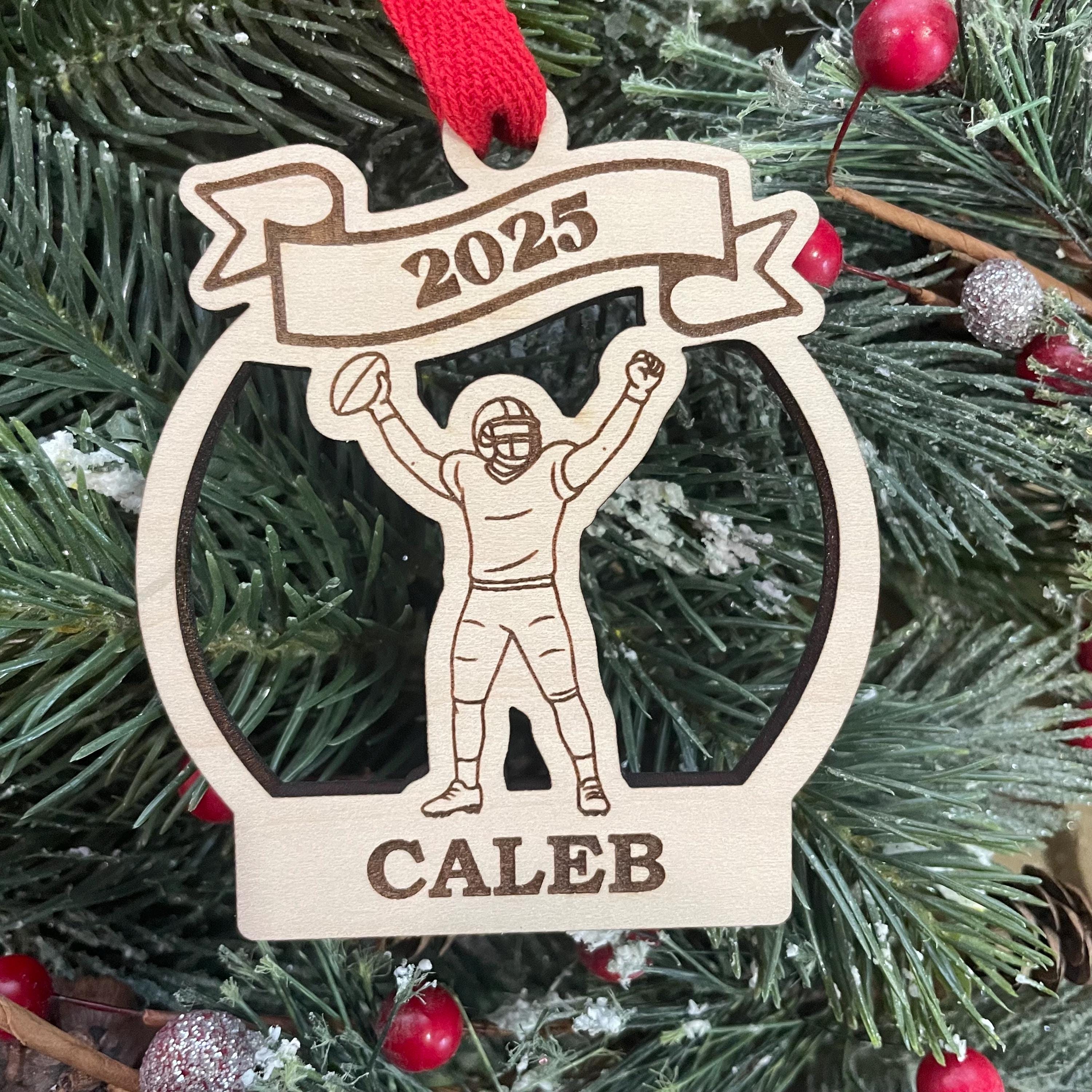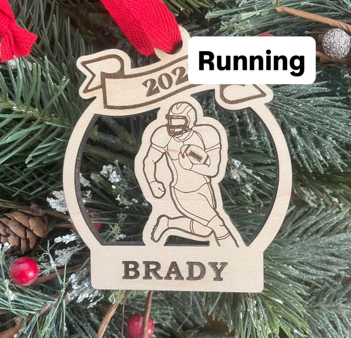 This is our 3.5” inch wood football player ornament engraved with name in block font as shown.