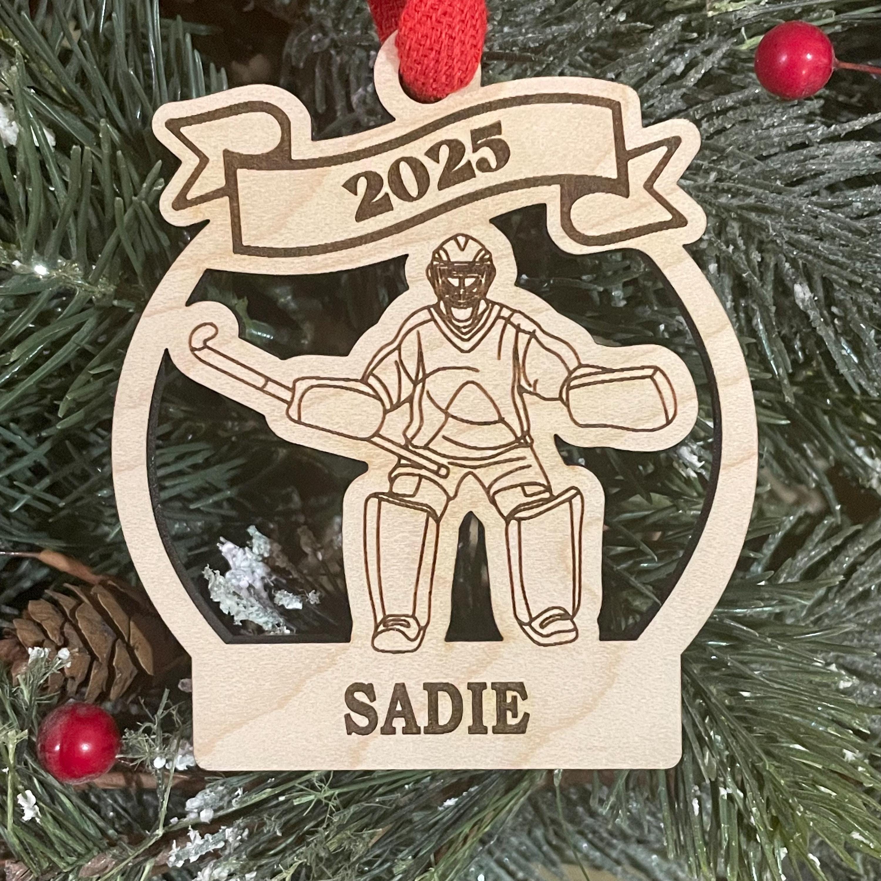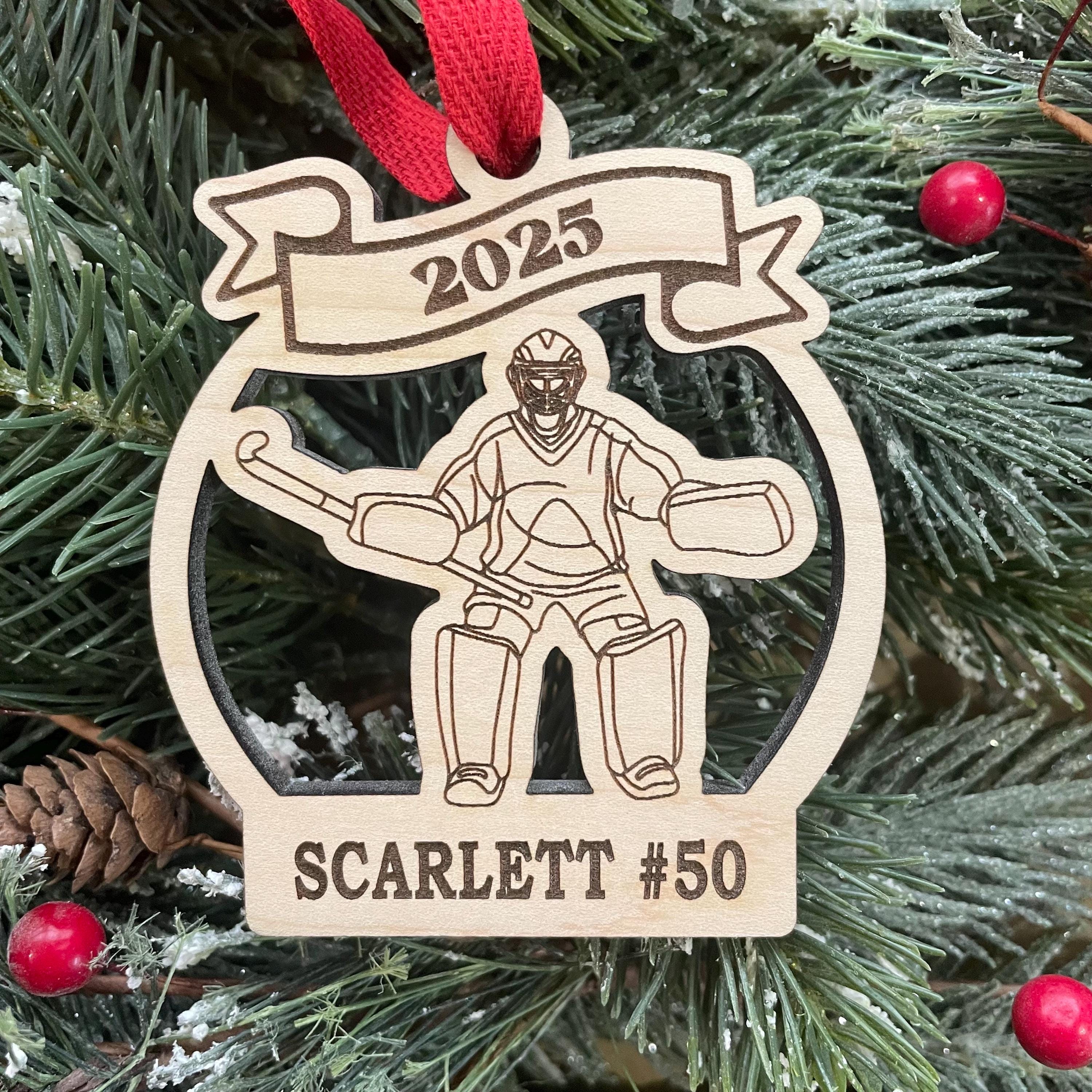 This is our 3.5” inch wood ornament engraved with name (feel free to include a # if desired) in block font.