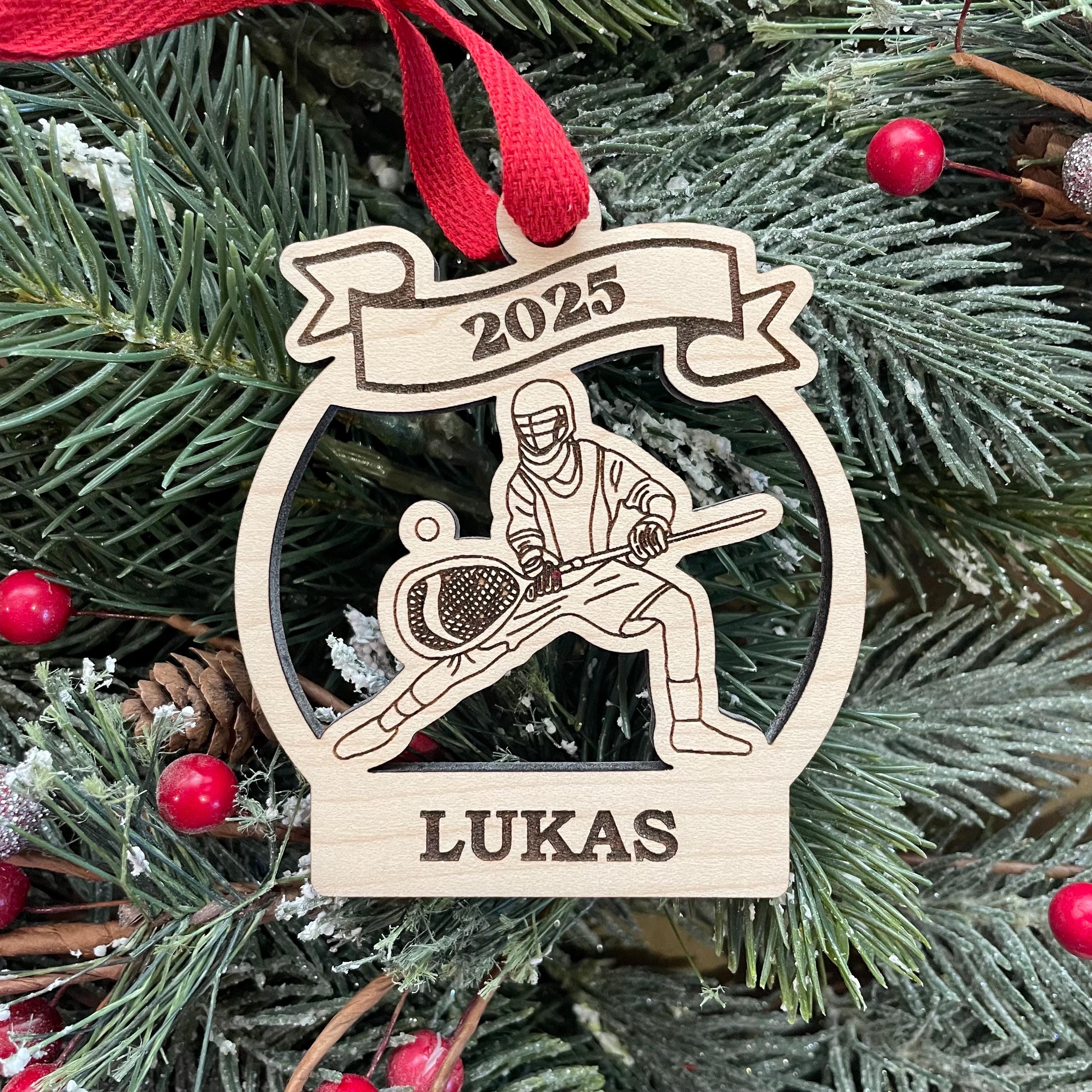 Score big with our personalized Lacrosse gift! 2025 3.5” inch wood ornament engraved with name (and # if desired.)