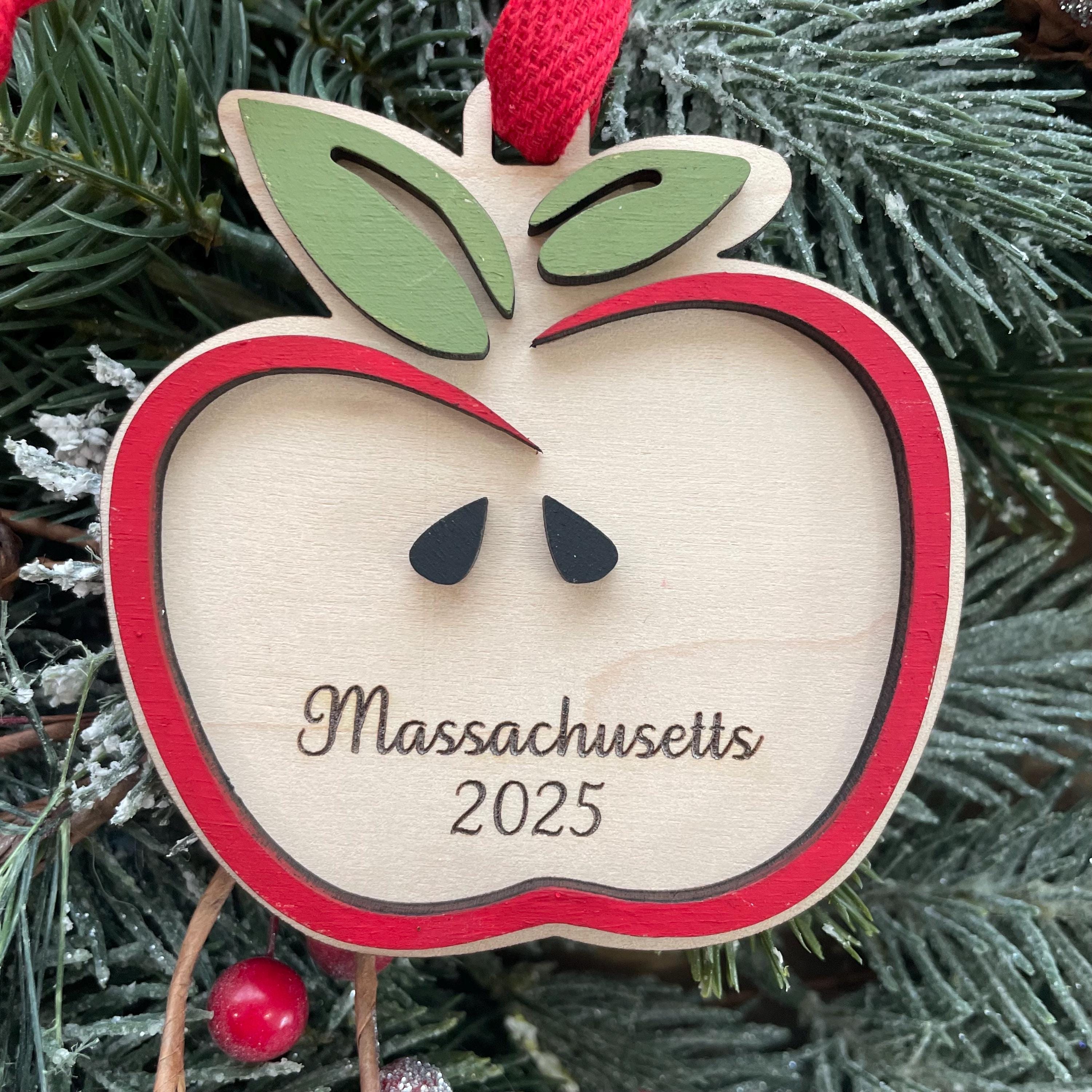 This is our 3.5 inch wood apple ornament customized as requested in the area below the seeds and ready to hang.