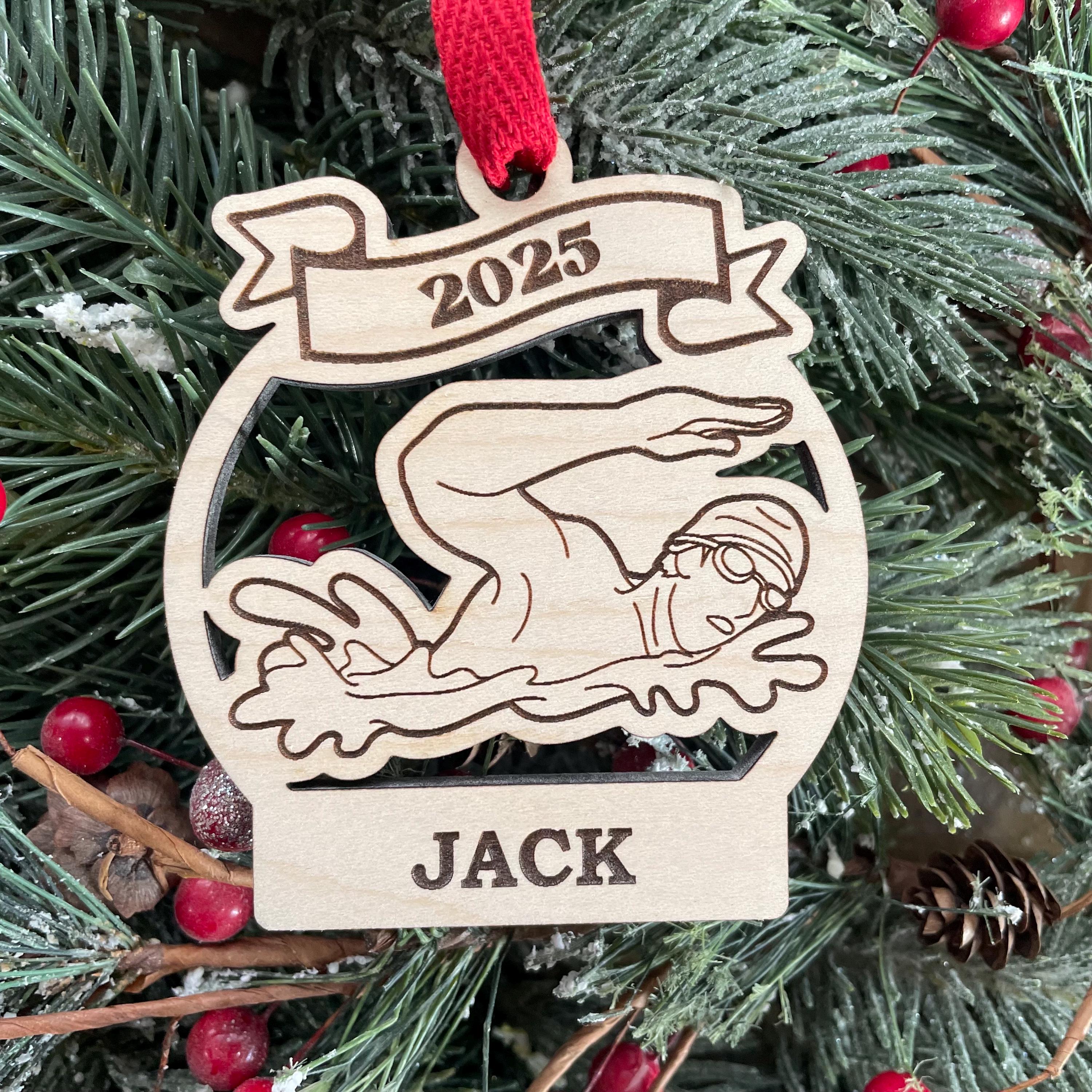 This is our 3.5” inch wood ornament engraved with name in block font.
