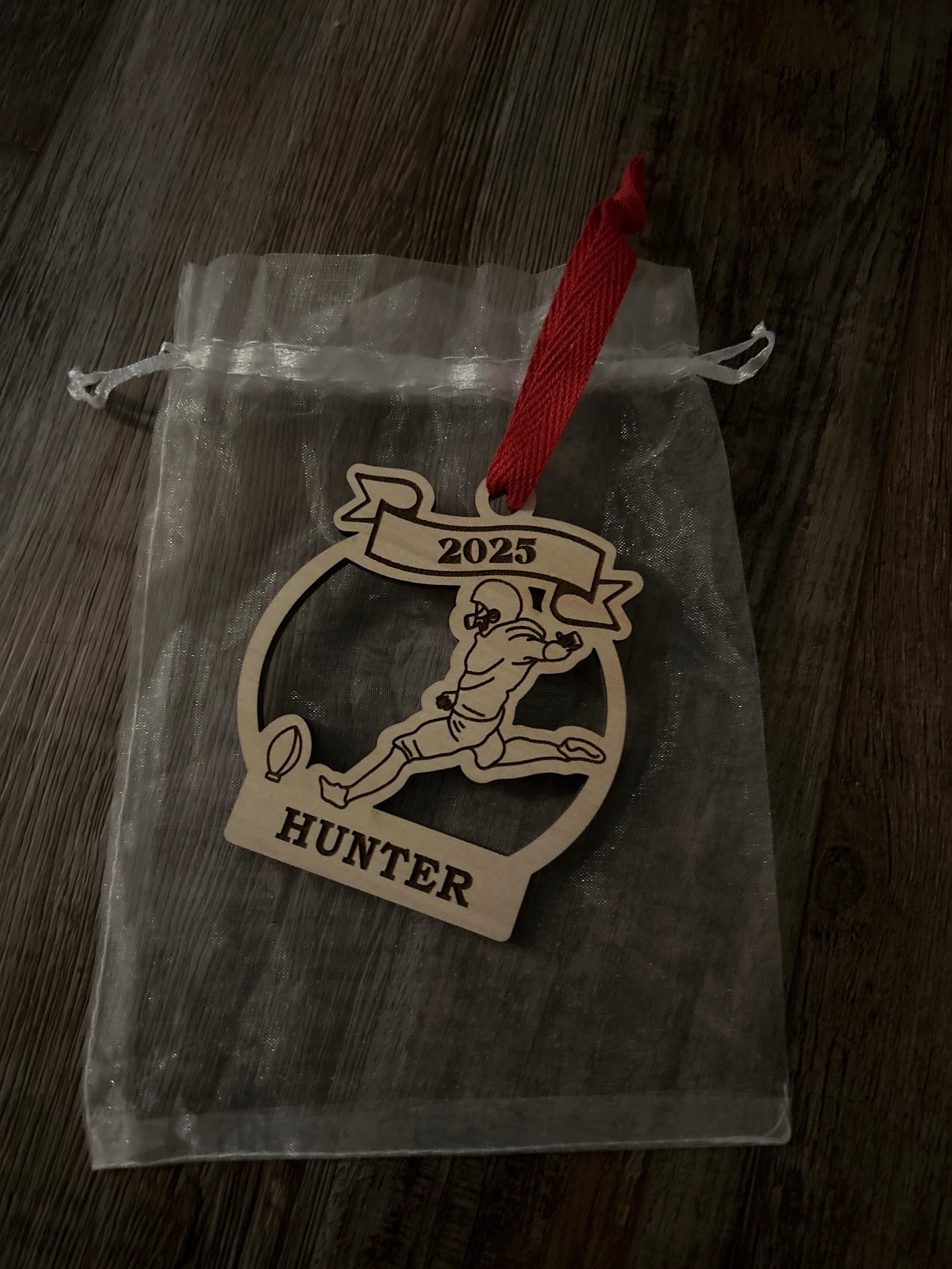 This is our 3.5” inch wood football player ornament engraved with name in block font as shown.