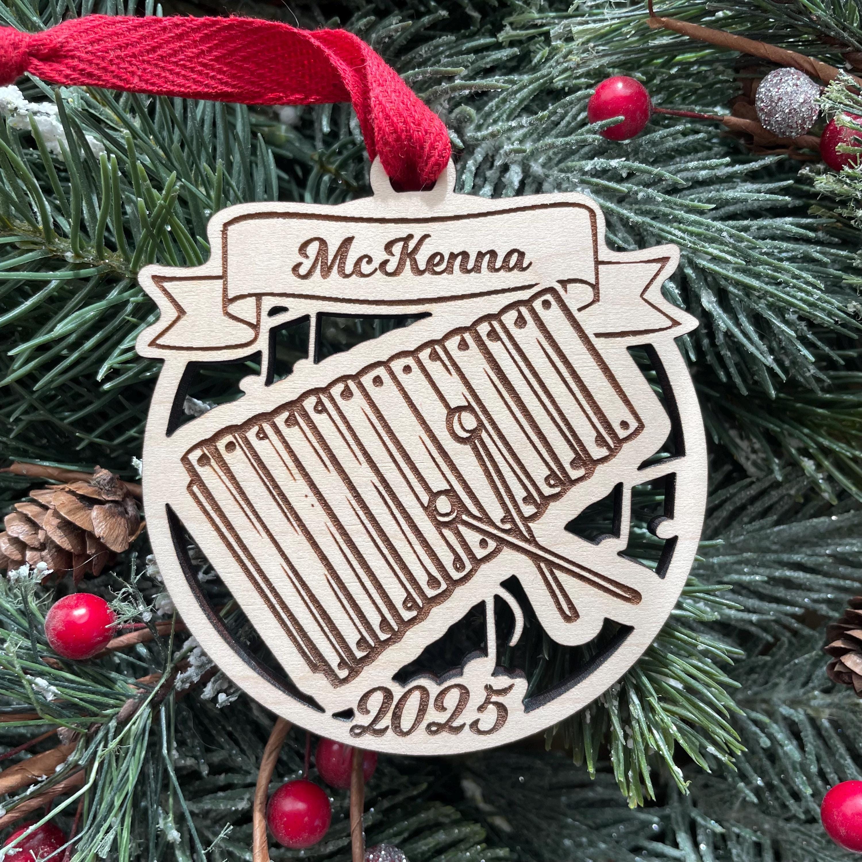 3.5” inch wood xylophone ornament engraved with name in font as shown.