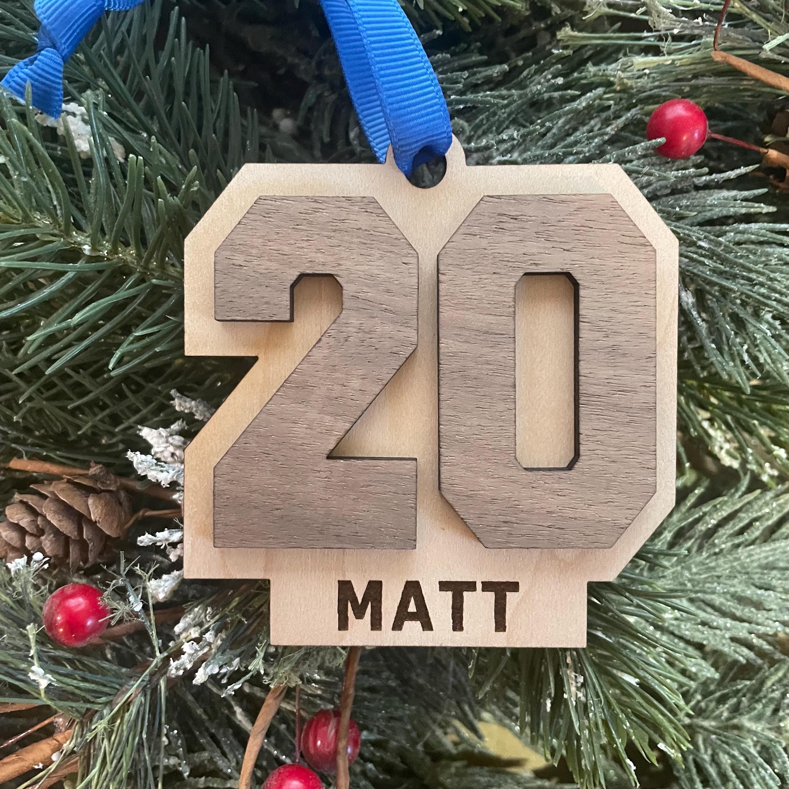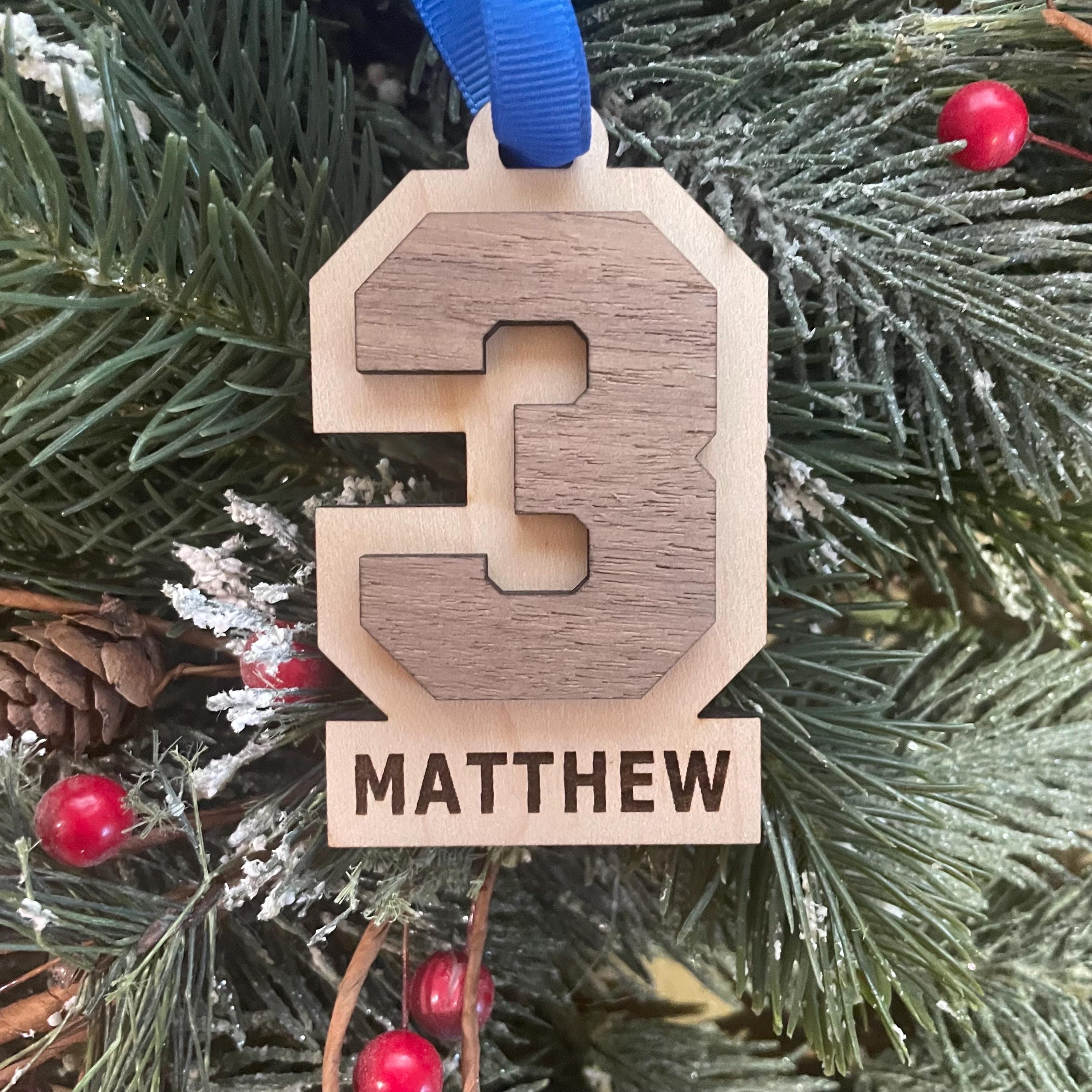This is our 3.5” inch wood player jersey number ornament engraved with name in block font as shown with either a number outline (design A) or a solid number (design b) as a 2nd top layer to make the ornament dimensional.