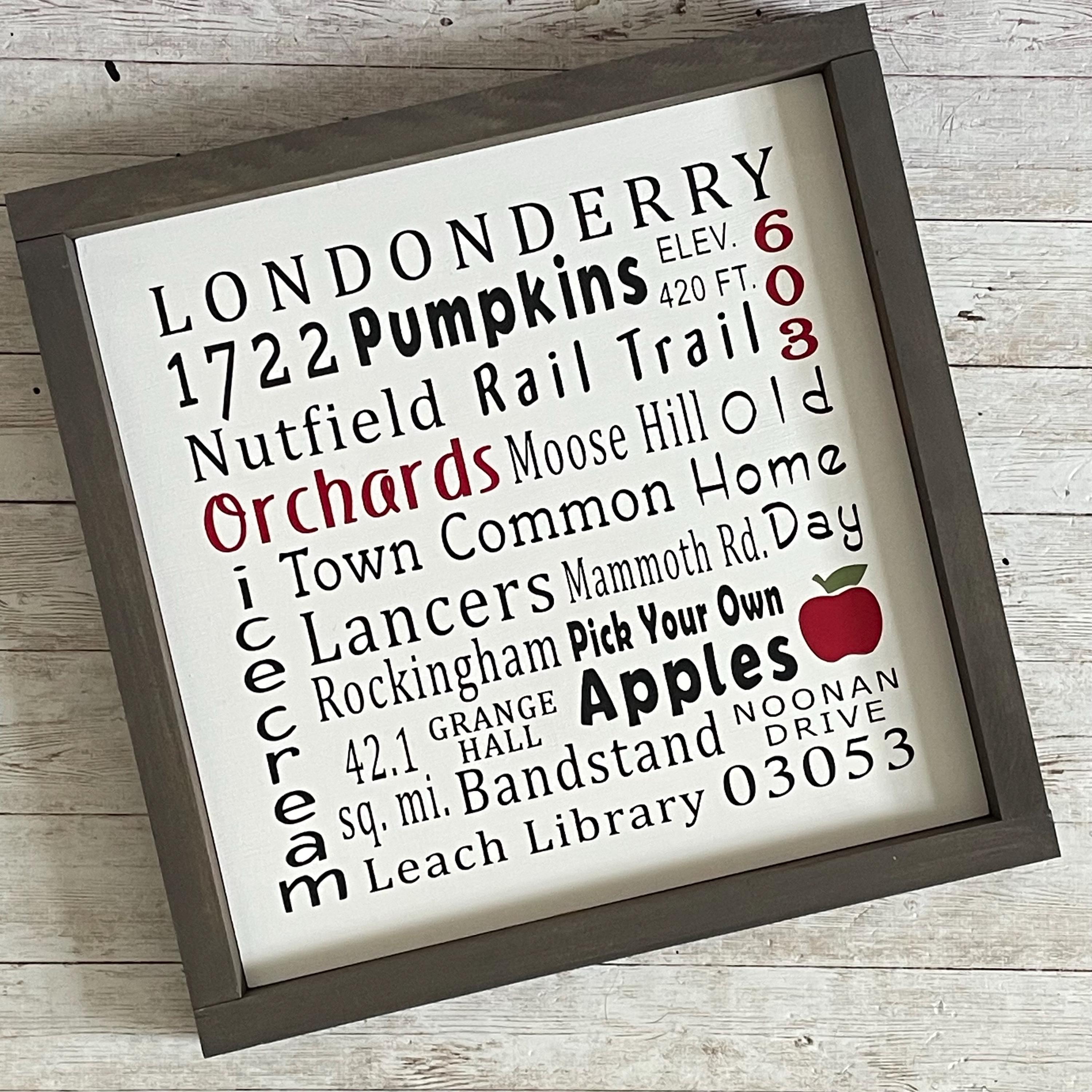 Celebrate the charm of Londonderry, New Hampshire with this handcrafted subway-style word art sign, featuring all the familiar favorites that make our town special — from Pumpkins, Rail Trail, and Orchards to Lancers, Rockingham, and the Leach Library. Every word is thoughtfully arranged to capture the spirit of the community we love.