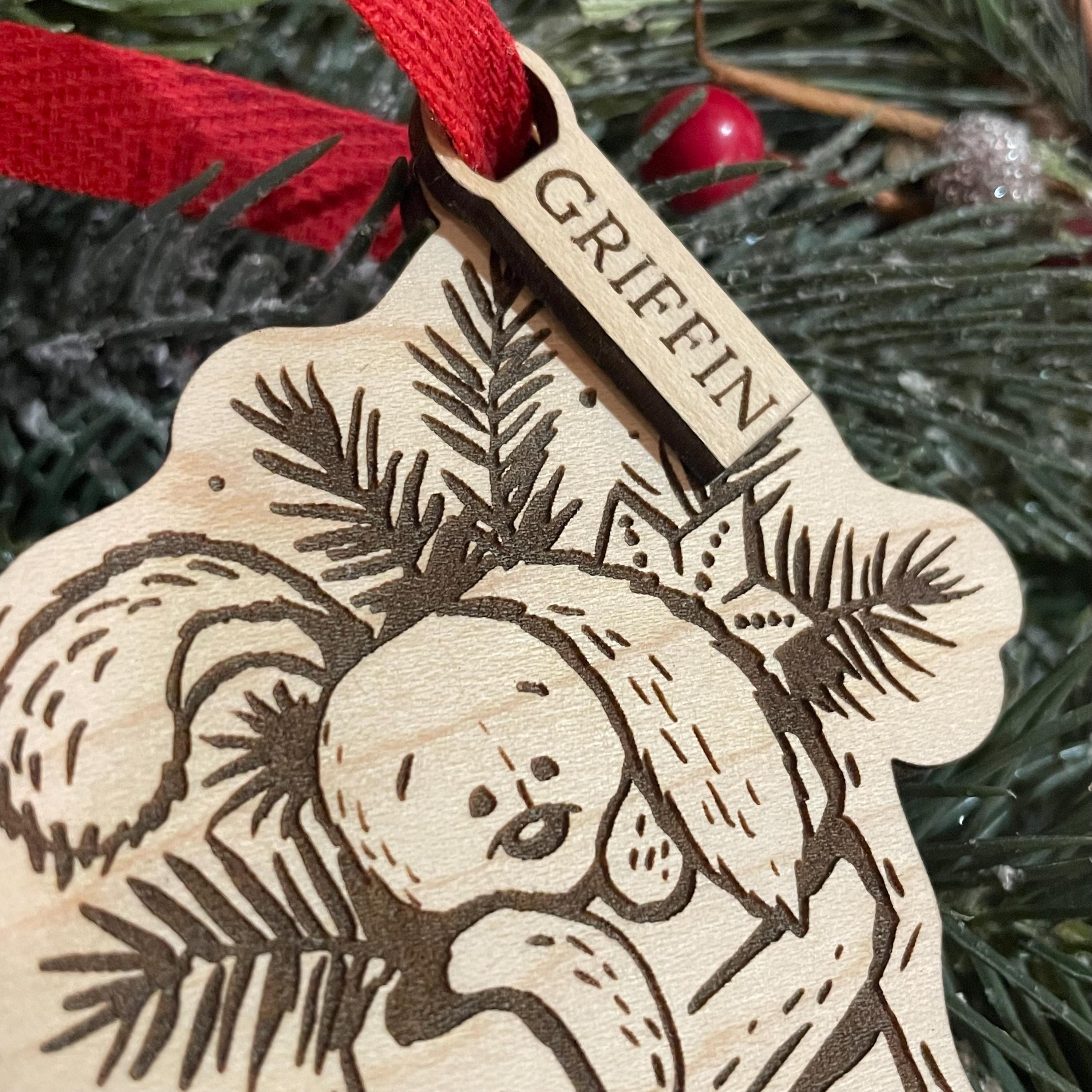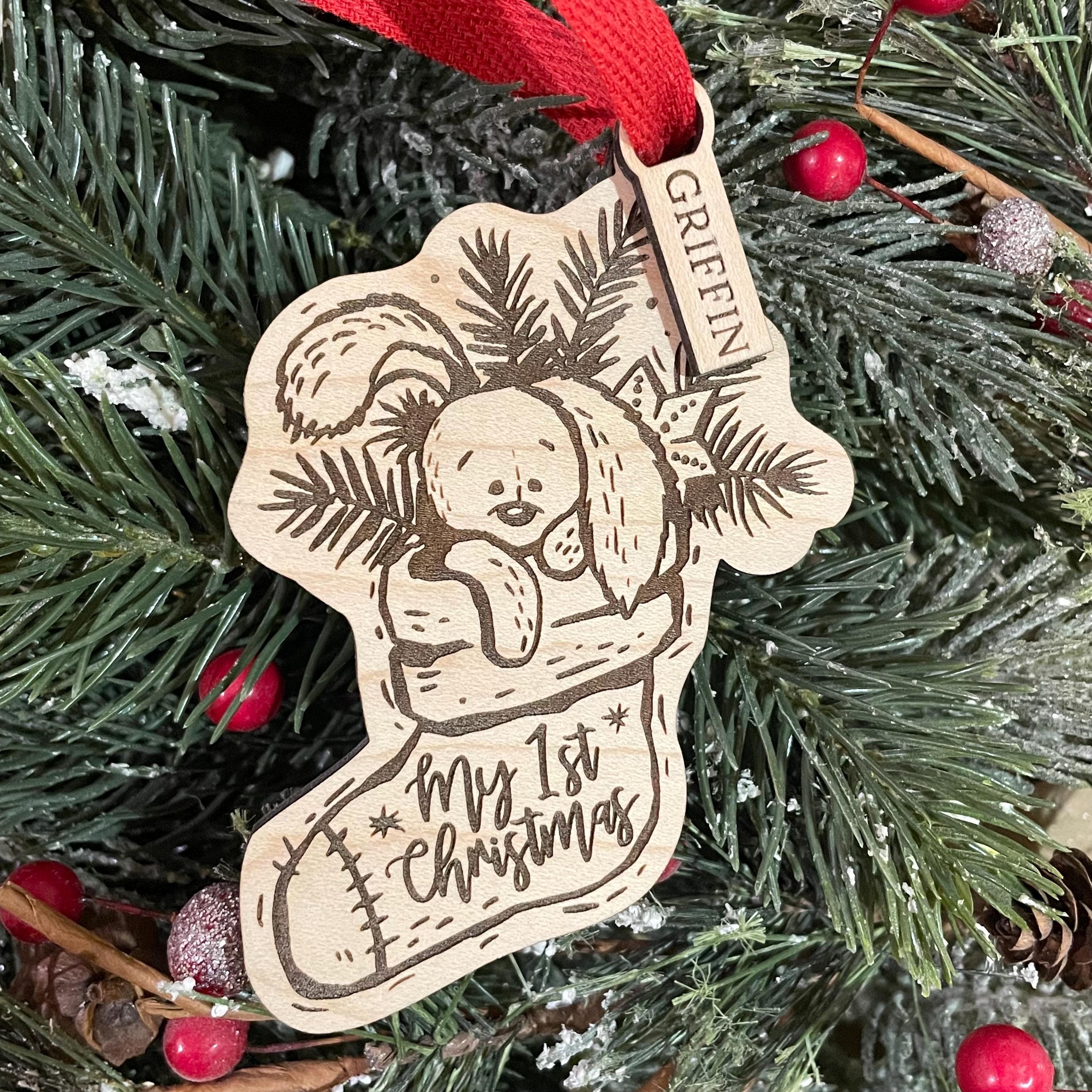 3.75 inch “My First Christmas” ornament with engraved bunny in a Christmas stocking. Wood ornament is laser engraved with design and ready to hang with ribbon (ribbon may vary from photo.)