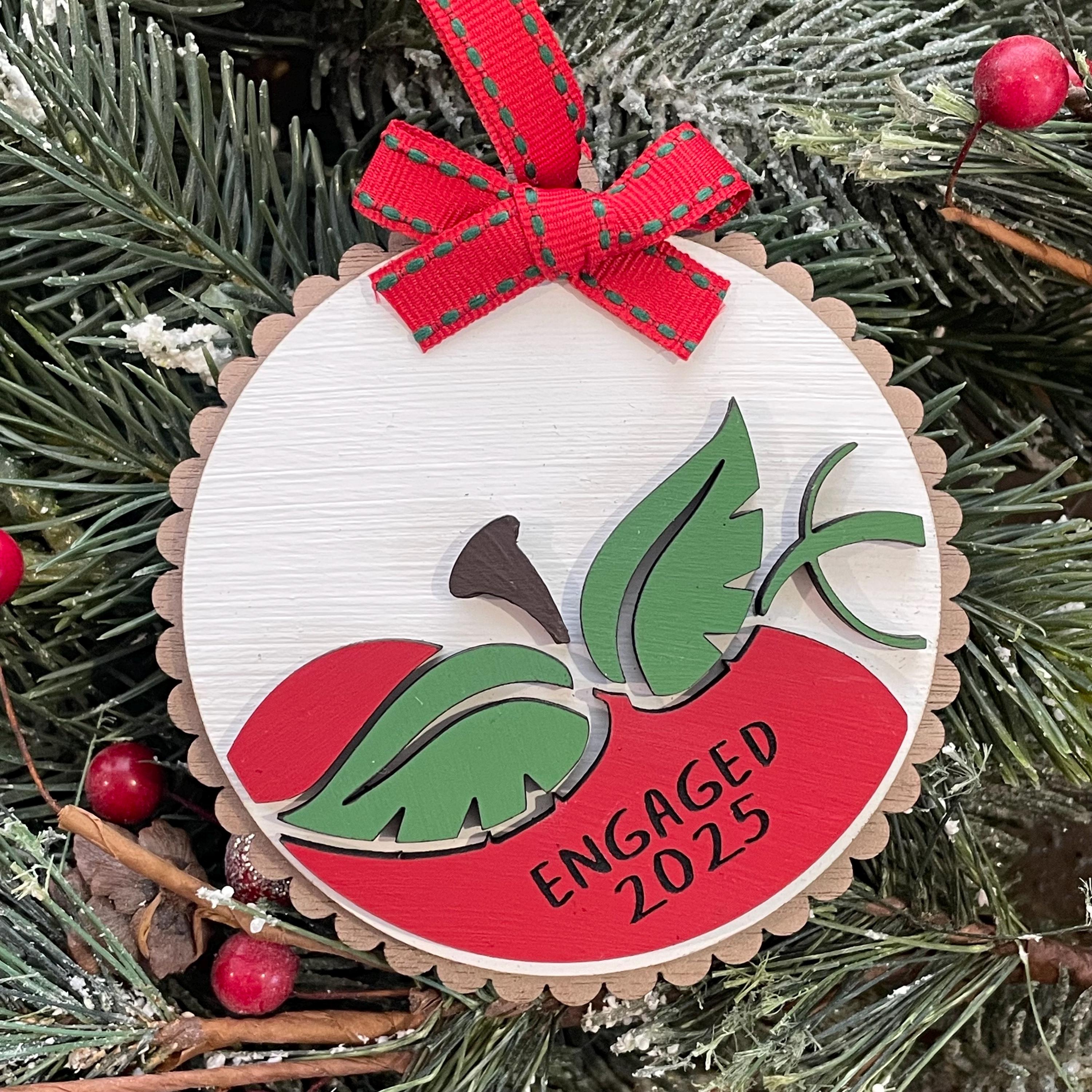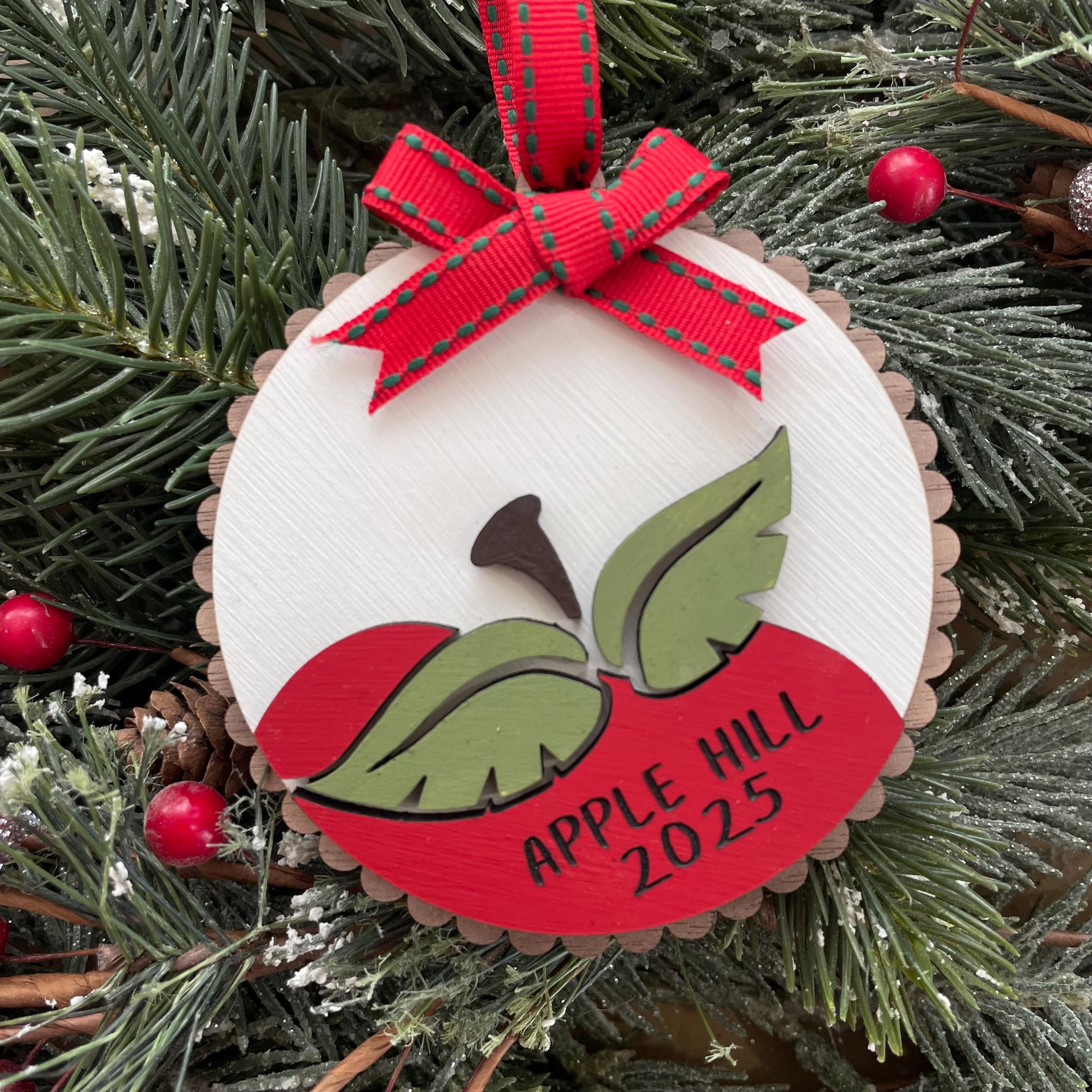 3.75 inch wood ornament with a cute apple and engraved last name or town name of your choice. Ready to hang with ribbon. Perfect for an apple picking keepsake to remember a special day or for those in apple tree towns like us!