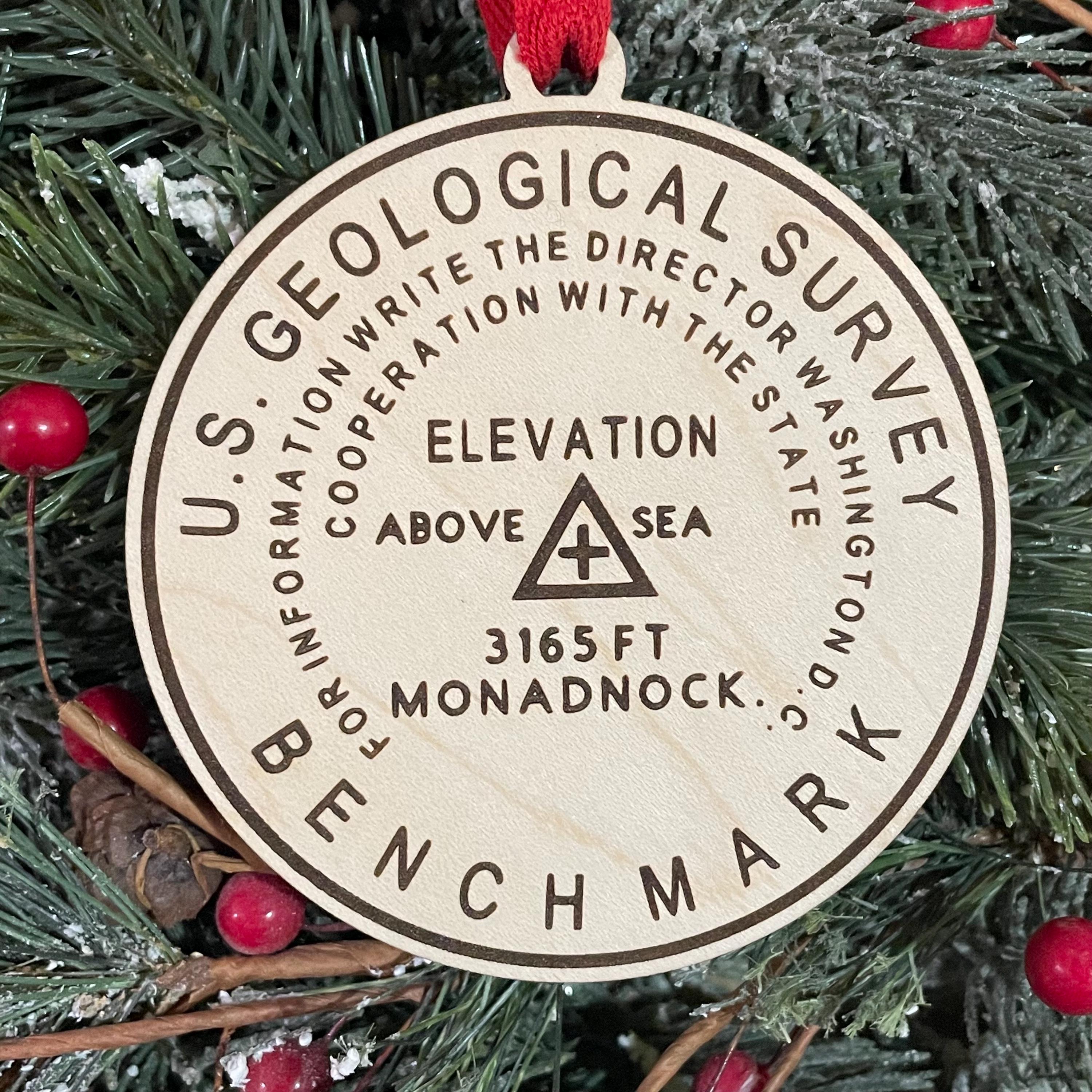 3.5 inch birch wood ornament engraved with the Mount Monadnock Bench Mark replica. Add a name, date or short note to the back. Ready to hang with ribbon (ribbon may vary from photo.)
